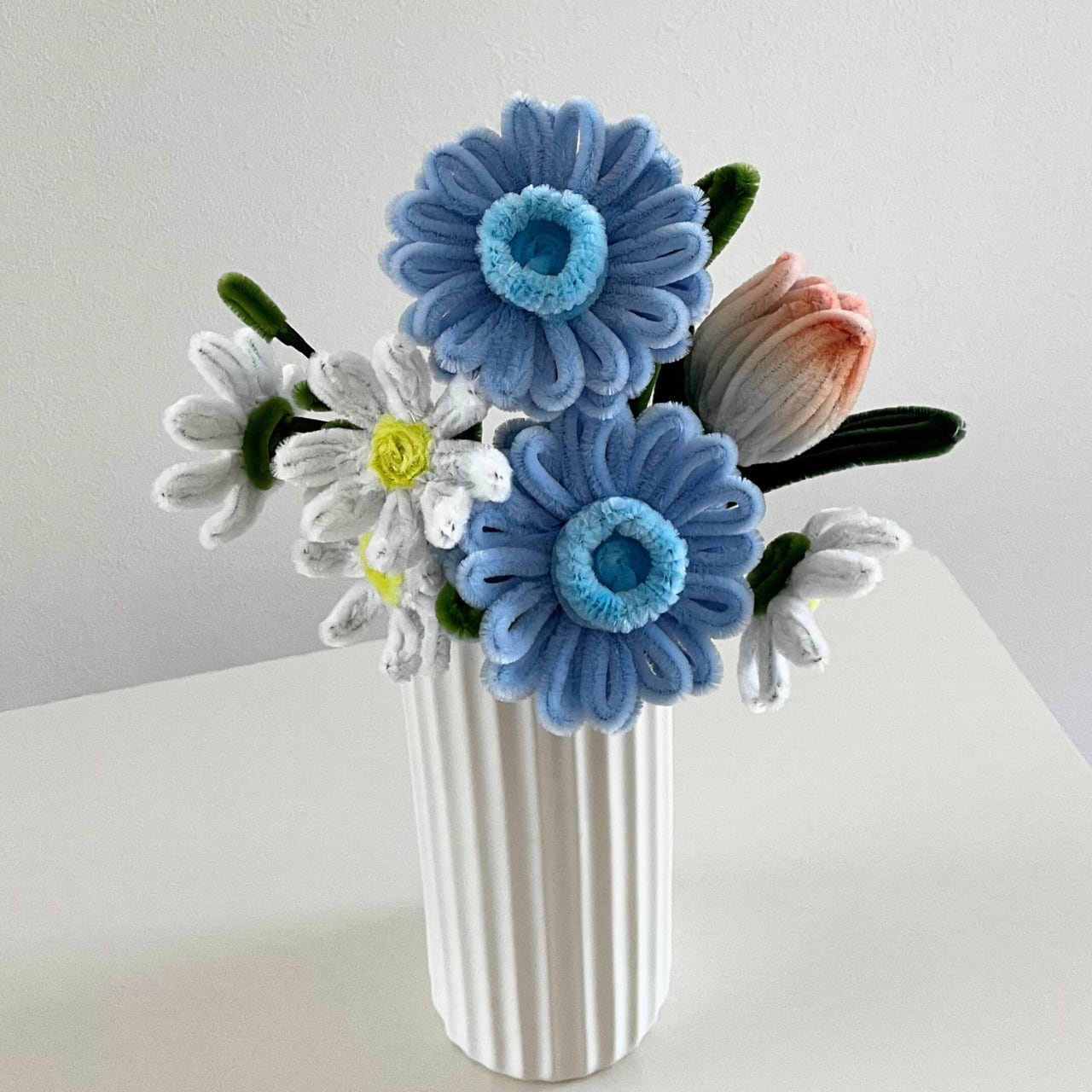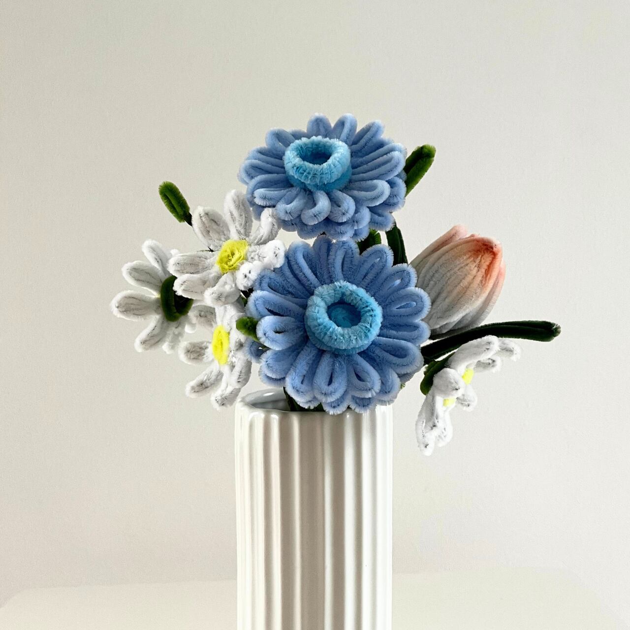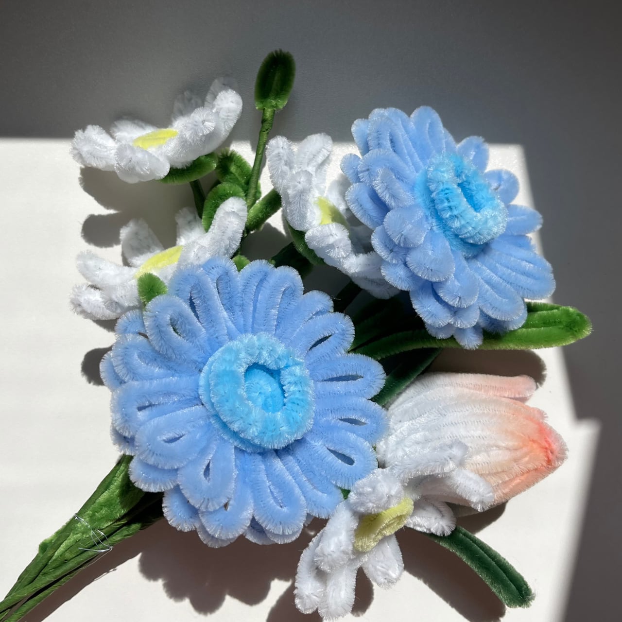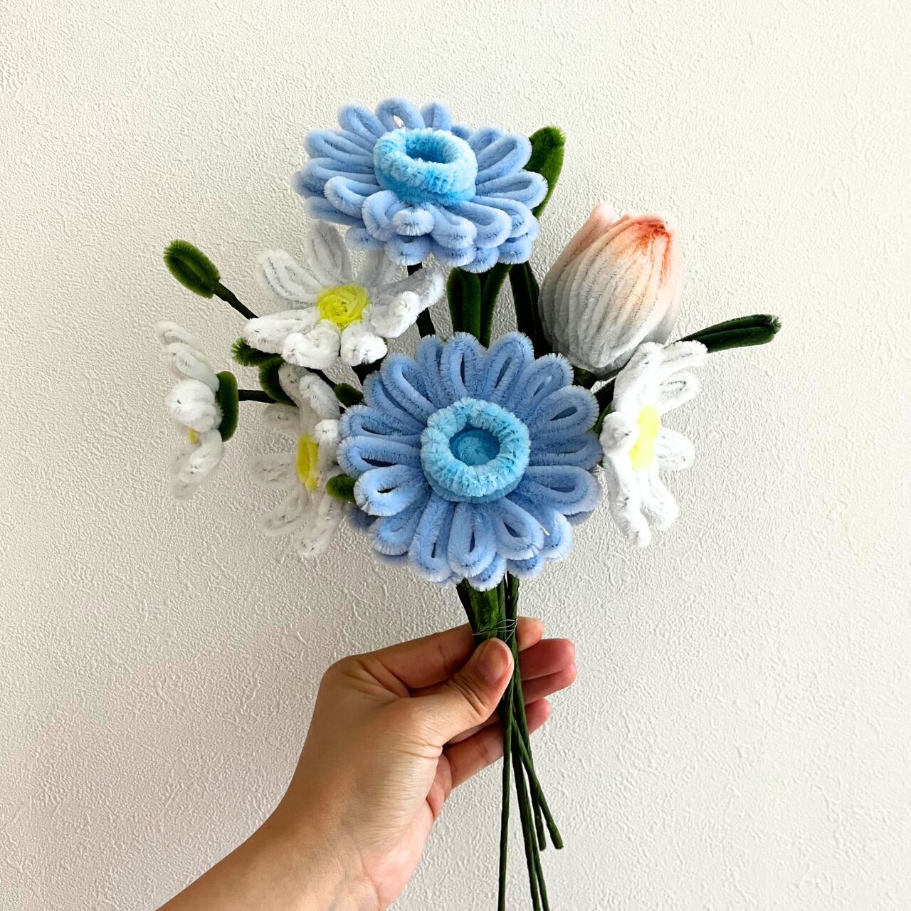 水色のガーベラを主役に、チューリップとカモミールを合わせた花束です。